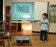 発表では、グループごとにまとめた手書きの発表用ワークシートが書画カメラに設置され、プロジェクターで大型スクリーンに表示された。「事例」を記したフリップを持ちつつ、自分たちの発表用作成物を指で示しながら「問題点」「解決法」などを説明していく。書画カメラを利用し、子ども達が前を向きながらプレゼンテーションできるように工夫されているため、発表者は説明しやすく、聞いている子どもたちにとっても分かりやすい発表スタイルだ。