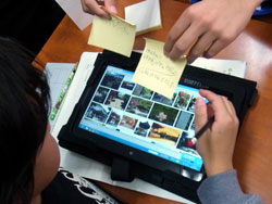 前半は一斉授業で、情報の分類や整理の方法について学ぶ。教科書教材の「メモ文」を電子黒板に拡大して提示し、そのメモで何が分かるか、もっと知りたいことは何かなどを押さえてから、グループ活動で自分たちの情報を「残す」「捨てる」「まとめる」「追加」して、「デジタルワークシート」にまとめる。デジタルワークシートは後にパンフレットにまとめるための資料となる。