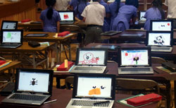 筑波大学附属小学校「ICT活用授業について考える会」は、「教科の特性を活かしたICT活用場面の拡張」をテーマに授業作りに取り組んでいる。ICT活動教室には、プロジェクター4台と電子黒板1台、タブレット端末40台(Windows8)を整備しており、今夏には、低学年の全教室に電子黒板を整備した。iPadも活用しており、購入も検討中だ。9月7日、研究会結成1年の成果として、2年生と5年生の授業を公開した。