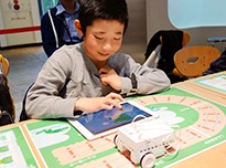プログラミングするのは列車の運行。事前に組み立てられた「列車」を紙の線路に合わせ、「まっすぐ走った後、曲がる」、「○○駅で止める」といった、モーターを制御する初歩的なプログラミングに挑戦します。このワークショップではブロックの造形は行いません。プログラミングの体験やスキルの習得だけでなく、「列車の制御」というテーマに沿って設定された課題を、解決へ向けて試行錯誤する楽しさを体験します。それは、現代社会における問題解決フローに照らし合わせた、実践的でクリエイティブな学びを得ることを目的としています。