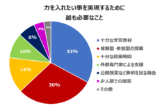 このような目的を達成するために最も必要なものとしては、「十分な学習教材」(33%)がトップとなり、「体験型の授業」(30%)、「十分な授業時間」(14%)との回答が続きました。困っていることとしては、「予算」(62%)、「IT環境」(56%)、「授業時間」(54%)の不足との回答が半数以上となりました。また、「情報」(34%)と「教員数」(30%)が不足しているとの回答も3割に上りました。この結果からは、教育現場における理想と実践には、一定程度のギャップがあることが推測されます。