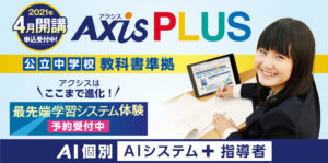 「AxisPLUS」は、日々の授業を行う「通年ゼミ」のほか「定期試験対策講座」・「春夏冬の講習会」・「中3生の入試対策講座」の機能も備えている。このシステムで主要5科目・中学3年間の学習が完結するよう設計されている。