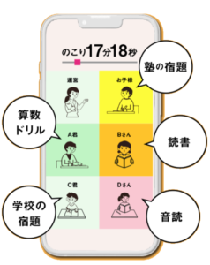 勉強を習慣化する時間帯を設定し、勉強仲間との待ち合わせ時間を決めることができる。同じ時間を設定した小学生同士で6人チームを自動的に編成(大人の運営1名含む)。図書館で友達と待ち合わせて、一緒に勉強するような感覚をオンラインで実現する。これにより88%のユーザーが「親の声かけが少なくなった」と回答している。