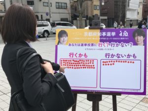 京都府選挙管理委員会は若者の政治離れの実態を把握すべく、4月10日(日)に行われる「京都府知事選挙」の広報PRを展開。京都の6つの大学の入学式で、新入生を対象として、投票に「行くかも」「行かないかも」のどちらかを選ぶアンケート調査を実施した。