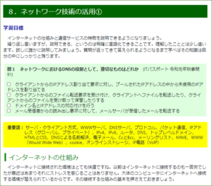 上記は「A1-8 ネットワーク技術の活用(1)」の冒頭となる。最初にこの章で学ぶ内容の問が設定されており、続いて重要語がピックアップされる。本文は必要最小限の情報や知識を濃縮した内容となっている。また、図や動画を使ってイメージしづらいネットワークの仕組みについても丁寧に説明している。