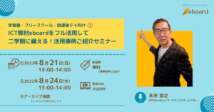NPO法人eboardは学習塾等向けオンラインセミナーとして「ICT教材eboardをフル活用して二学期に備える!活用事例ご紹介セミナー」を8 月 21 日(日)・24 日(水)の2日間、無料開催する。