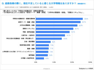 高校教員が重点的にチェックする大学情報、最多は「入試方法・入試科目」。現時点で不足を感じる情報は、「卒業生の就職状況・就職支援制度」がトップ。特に大学進学率50%以下の高校で割合が高く、大学進学率50%以上の高校では「研究テーマ・業績・評価」を不足と感じる割合が高い傾向にある。
