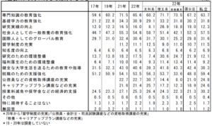 子供の入学大学に対して期待することは「専門知識の教育強化」65.6%、「社会人としての一般教養の教育強化」54.6%、「就職のための支援強化」53.5%(国公立48.8%・私立59.4%)に過半数の保護者の期待が集まり、また「授業料減免や奨学金などの経済的支援」も4 人に1人(25.3%)が期待している。