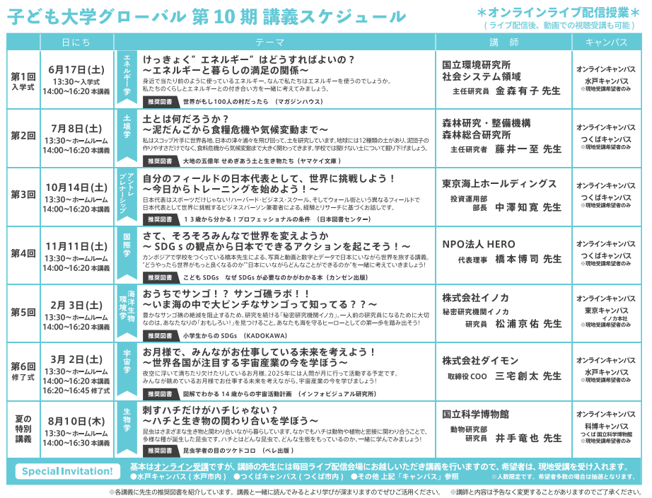 これまで9期にわたって延べ100人の専門家が登壇し、15,000人以上の親子に講義を受講した。10期となる今年のテーマは「宇宙の仕事・土のナゾ・サンゴの秘密・エネルギーを考える・蜂の生態・カンボジアに学校をつくる・アントレプレナーシップ」。