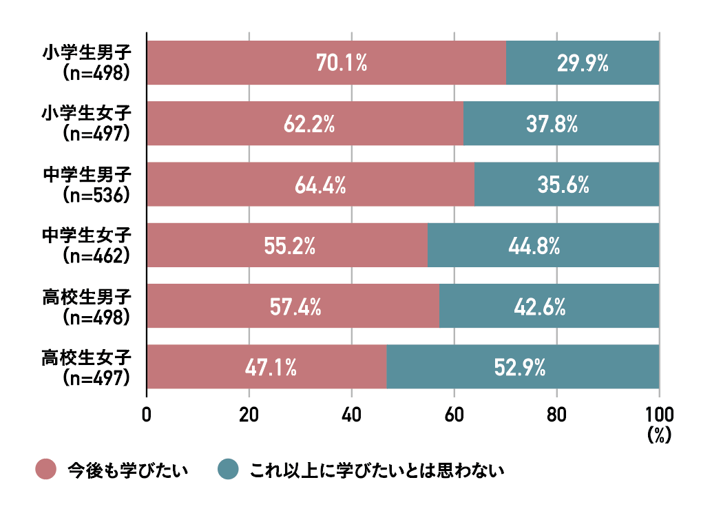 また、プログラミングの学習を継続したいかどうかに関して、「これ以上に学びたいとは思わない」と回答した割合も、全ての学校種において女子の方が高い結果となった。特に、高校生女子は「これ以上に学びたいとは思わない」が全体の半数を超える。
