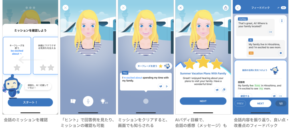 会話後にはミッションの結果と、AIバディ視点で会話への感想(メッセージ)が表示され、会話内容は音声とテキストで振り返ることができる。