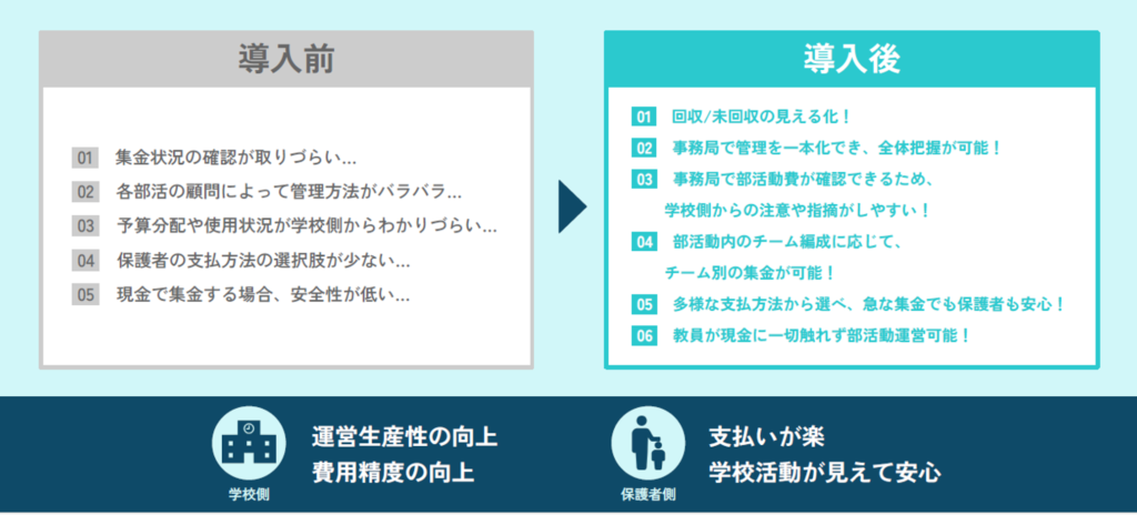 本システムを利用することで、これまで現金・アナログ管理だった部活動の集金管理をキャッシュレス・デジタル化できるだけでなく、部活動における、お金の管理を事務局で一本化することができるため、学校の部活動運営の全体把握ができるようになる。