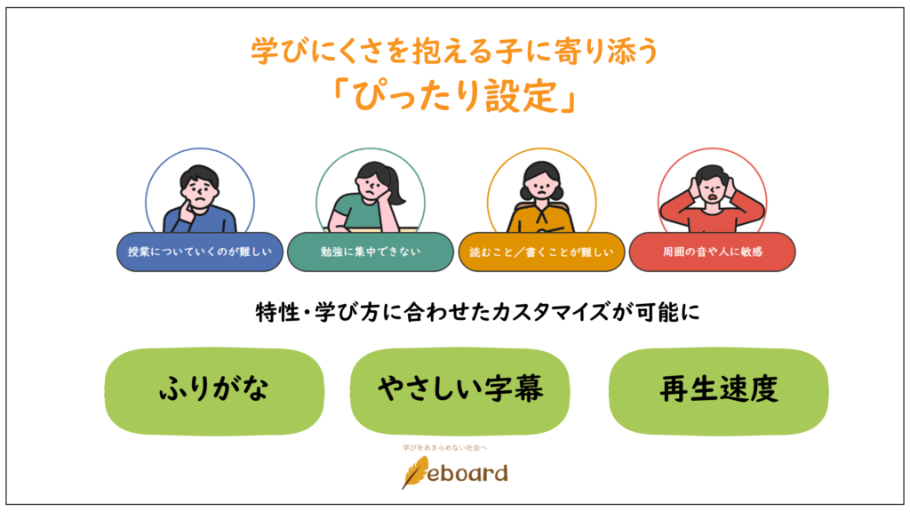 ICT教材eboardの「ぴったり設定」は、発達障害などにより様々な学びにくさを抱える子が、自分に合った設定で学びやすくなるよう設計されている。