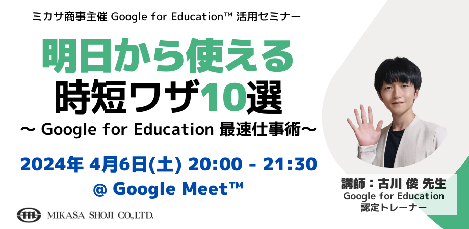 ミカサ商事は、教職員向けICT活用セミナー「明日から使える時短ワザ10選〜 Google for Education 最速仕事術〜」を4月6日にオンライン開催する。本セミナーは、同社が運営する教員向け Google for Education 活用コミュニティ「G-Apps.jp Community」が定期的に開催するイベントの一つ。誰でも無料で参加可能。