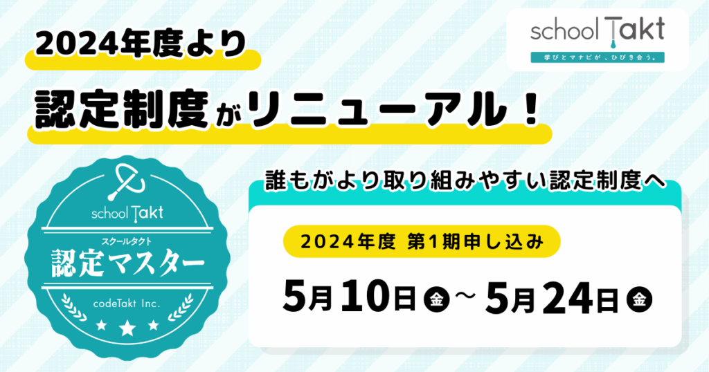 なお、新制度は2024年度第1期からのスクールタクト認定マスターより適用となる。2023年度中までに取得された認定は、制度改訂後も有効となるが、今後より上位ランクの認定取得を目指す場合は、新制度の認定ステップに則したブロンズ認定試験からの取り組みとなる。