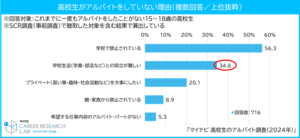 これまでアルバイトをしたことがない高校生のうち、長期休み中にアルバイトをしたいと考えている割合は79.2%。現在アルバイトをしていない理由は「学校生活(学業・部活など)との両立が難しい」が34.6%で、「学校で禁止されている」の56.3%に次いで上位となっている。高校生にとって、夏休みなどの長期休みは学期中より自由に使える時間が多く、時間に余裕が生まれることからアルバイトが増えるタイミングとなっていると考えられる。