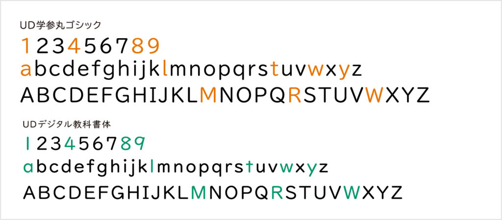 英数字は、ロービジョンの方へのヒアリングを踏まえ、読み間違えにくいことに焦点を当てた丸ゴシックの形状が優先されている。学校で習う形状とは異なるが、「1」と「l(小文字エル)」や、「a」と「o」、「W」と「VV」などの読み間違いを減らす工夫が施されている。グラフや表組みの数字表記などにも適している。