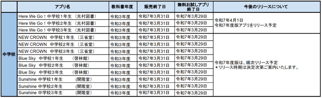 2025年度の教科書改訂に対応した新しいアプリのリリース予定については下表のとおり。