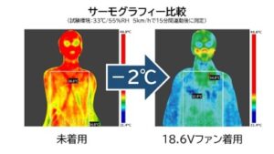 カンコー学生工学研究所が独自に信州大学の人工気象室(温度33℃/湿度55%)で実験した結果、ファン付きウェア(18.6V)は未着用時に比べ、衣服内湿度を最大約40%低減することが分かった。