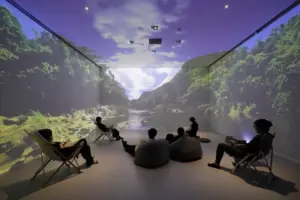 都会でも本物の自然空間にいるような感覚を味わえる「デジタル森林浴」。大型マルチスクリーンや音響、香りなどを駆使し、屋内で自然に包まれる体験を再現する。この体験では、実際に森林浴をしたときと近い水準の生理・心理的な改善効果が得られる。(提供:フォレストデジタル株式会社)