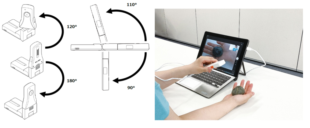 卓上置きはもちろん、内蔵マグネットによりスチールラックや壁などにも取り付けが可能。2つの回転する関節により、上下左右、自由に撮影の方向を変えられる。また、手に持って資料や立体物などの被写体に近づけて撮影することも可能(最短100mm)。