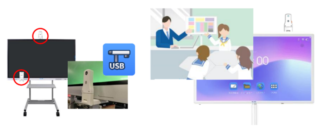 利用環境にいつでもカメラ機能を追加できる高解像なWEBカメラ。コンパクトなサイズ、マグネット脱着式で設置場所を選ばない。マグネットで接着できない場面でも付属の取付鉄板を設置すれば、どこでも取り付けできる。様々なICT機器との高い連携性を備える。PC/タブレットと組み合わせて、また、卓上WEBカメラとしても利用可能。「ELMOカメラ」アプリやその他USBカメラ対応アプリと連動し、教室全体を俯瞰した画面共有も可能。USB Type-C/A接続に対応したシンプルインターフェース。