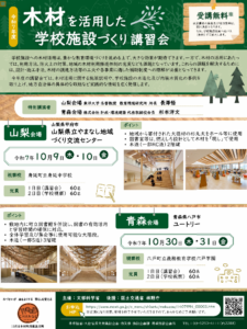 文部科学省は学校施設に木材を活用するにあたり、建築コストや維持管理の手間、防火上の対策などの課題解決に向けて、2025年度「木材を活用した学校施設づくり講習会」を、10月9日(木)・10日(金)に山梨会場、10月30日(木)・31日(金)に青森会場で開催する(受講無料)。