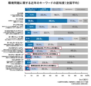 環境問題に関する近年のキーワードでは、全国平均では「フードロス」「カーボンニュートラル」の認知度が高かった。また、「バイオダイバーシティ」「ネイチャーポジティブ」「プラネタリーバウンダリー」など、比較的専門性の高いワードも一定の認知度があり、全ての項目において、高校生世代の認知度が一番高いという結果になった。