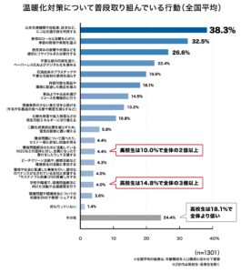 また、高校生世代については「学校や職場で環境問題解決に向けた活動や企画提案を行う」14.8%と、「環境問題解決のために活動している NGO などの団体に対し、会員になったり寄付をしたりして支援する」10.0%など、環境問題に対して積極的な行動をとっていることが伺える。