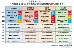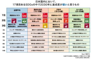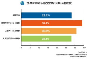 日本における現時点の感覚的なSDGs達成度は、高校生世代32.8%、Z世代28.5%、大人世代24.5%と、若い世代ほど高くなっている。達成度を0と回答したのは全国平均13.3%(174人)となり、危機感を持っている人も多い。全国平均は25.1%で、2030年の100%達成という目標には、ほど遠い数値となっている。