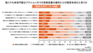 環境問題の解決に向けて個人が取り組めるアクションについては、高校生世代の73.3%が、「環境系NPOや市民団体イベント活動にボランティアとして参加する」や「地域の再エネや省エネのプロジェクトに参加・見学する」ことを有効と回答するなど、イベントやプロジェクトへの参加を有効と考えている人が多い。高校生世代は全てのアクション項目について有効と捉える割合が高い。逆に大人世代はいずれの項目も「まったく有効だと思わない」との回答が2割弱あり、日常生活や経済に付随する活動をポジティブに評価している。