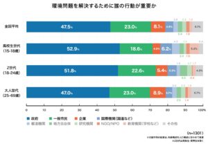 「環境問題を解決するために誰の行動が重要か」については、全世代共通で1位が政府、2 位が一般市民だった。一方、高校生世代では3位が国際機関(6.2%)、4位が教育機関(5.2%)であるのに対して、Z世代・大人世代は3位に企業(それぞれ5.4%、8.9%)、4位はZ世代が国際機関(5.2%)、大人世代がその他(6.7%)という順になっている。