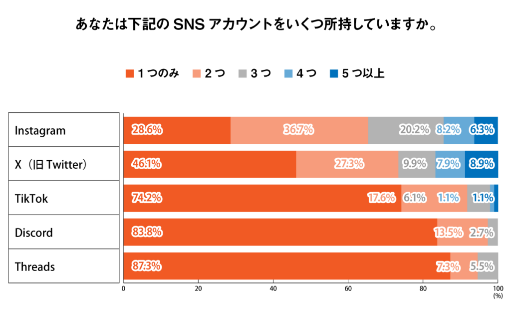 SNSのアカウントに関しては、「Instagram」は70%以上が、「X(旧Twitter)」も過半数が2つ以上と回答した。