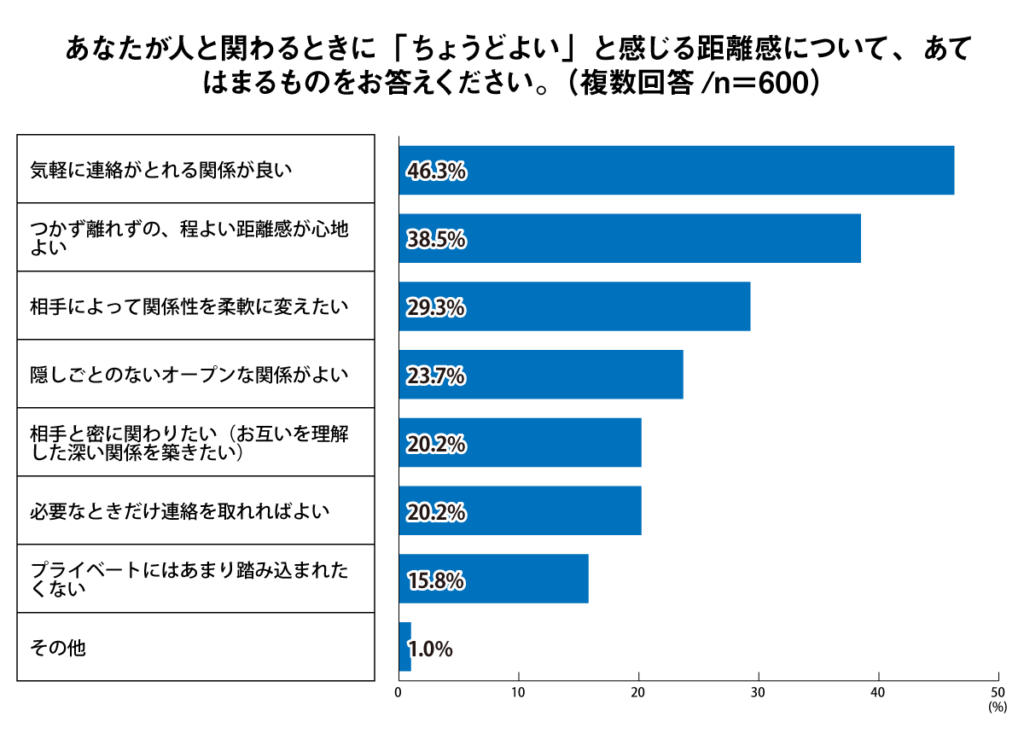 回答率が最も高いのは、「気軽に連絡がとれる関係がよい」で46.3%。次いで「つかず離れずの、程よい距離感が心地よい」が38.5%、「相手によって関係性を柔軟に変えたい」が29.3%、「隠しごとのないオープンな関係がよい」が23.7%と続く。