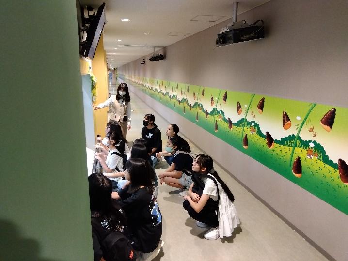 明治なるほどファクトリー大阪で「きのこの山」の製造工程を見学して、ものづくりの魅力を体感。女性社員との座談会の後は「理系もいいなと思った」など、理系進路に前向きな声が出ていた。