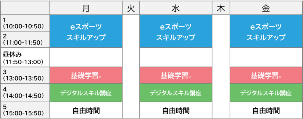 さらに、eスポーツを通じて仲間とつながる居場所を提供するとともに、eスポーツと親和性の高いデジタルスキルを学べる授業を実施し、デジタルスキルの基礎と興味・関心を育む。また、基礎学習はオンデマンド教材を用いて生徒個々のレベルに合わせた授業を行うことによってサポートする。