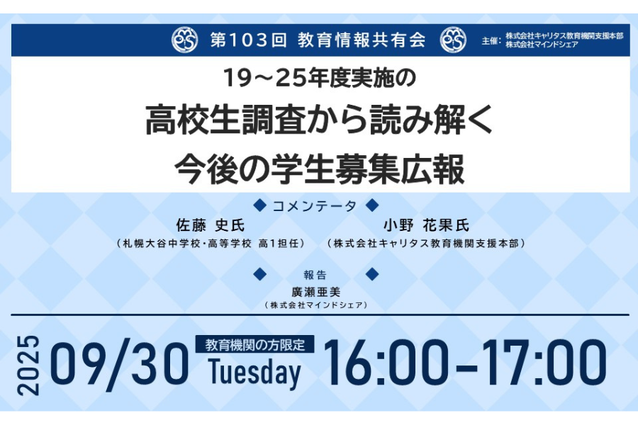 マインドシェアは9月30日に、第103回教育情報共有会をオンラインで開催する。キャリタス教育機関支援本部との共催。「19~25年度実施の高校生調査から読み解く今後の学生募集広報」をテーマに、高校生の進路選択の実態やその変化の傾向を浮き彫りにし、今後の学生募集広報のあり方について考える。参加無料。