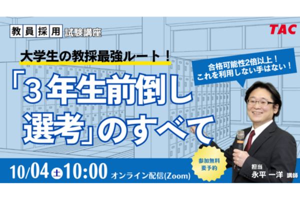 TACは10月4日に、教員志望の大学生を対象に「大学生の教採最強ルート!『3年生前倒し選考』のすべて」と題したセミナーを開催する。