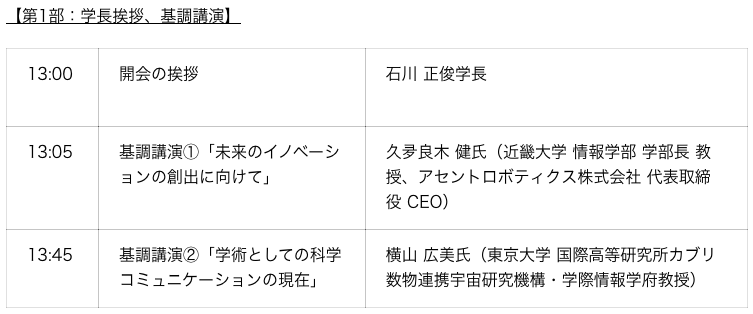 基調講演では、ソニー・コンピュータエンタテイメントで「プレイステーション」の開発に携わり、現在は近畿大学情報学部学部長を務める久夛良木健氏、東京大学国際高等研究所カブリ数物連携宇宙研究機構・ 学際情報学府教授の横山広美氏が登壇する。