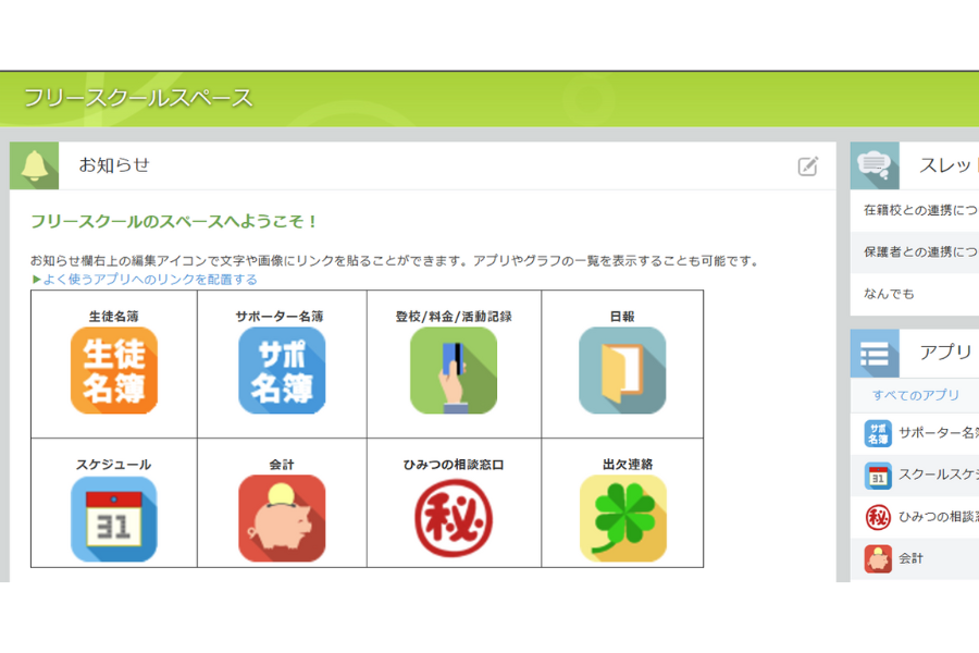 フリースクールの日々の運営効率化と、保護者や在籍校との情報共有を支援。生徒名簿、出欠管理、活動記録、スケジュール管理、会計など、運営に必要な各種情報に加え、領収書や活動報告書(通所状況報告書)の帳票出力にも対応する。
