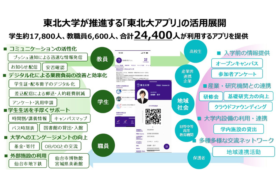 東北大学は、学生・教職員計24,400人が利用可能なスマホ学生証・職員証機能を中核としたデジタル基盤として、大学公式スマホアプリ「東北大アプリ」を、今年度より運用開始した。アプリの開発とシステム構築および運用支援を内田洋行が担当している。