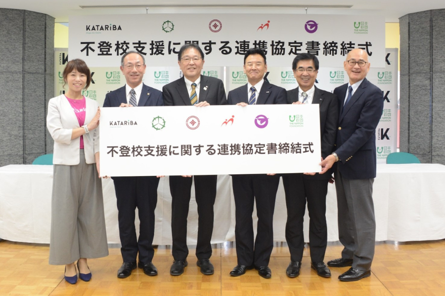 10月2日、日本財団ビルにて、日本財団・カタリバ、青森県三沢市、東京都国分寺市、広島県三次市、鹿児島県大崎町と連携協定を締結。不登校支援に課題を抱える自治体をサポートし、子供たちの学び・支援を目指す。