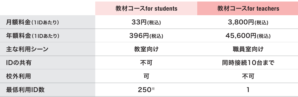 学校向けに販売中の「教材コース」を「教材コース for teachers」に名称変更し、「教材コース for students」を新設。職員室向けの「for teachers」は学校内限定で一つのIDを同時に10台まで複数名で利用可能。「for students」は一人ずつにIDを発行し、個別のタブレットやPCで閲覧できるので自宅学習にも利用できる。