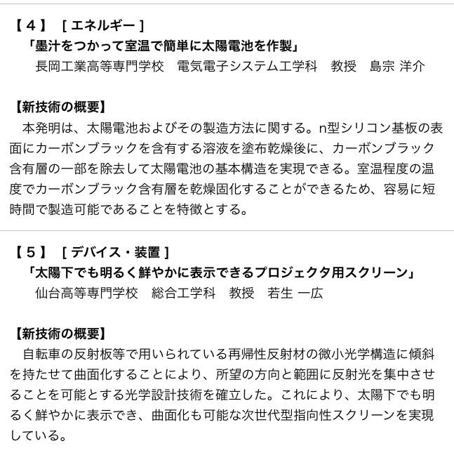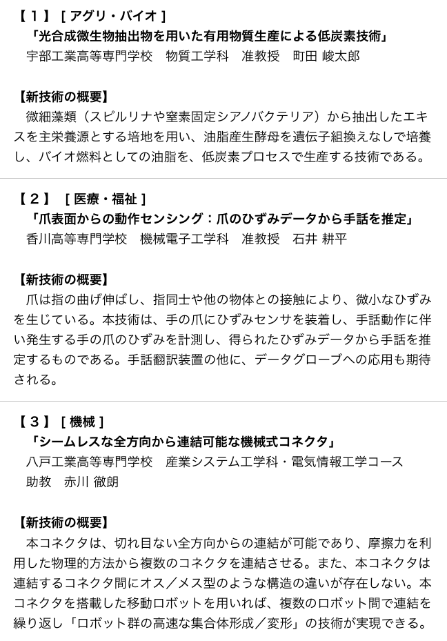 高専機構から創出された研究成果に基づく特許技術による新技術説明会。ライセンス可能な特許技術を発表することを原則としており、研究者自らが、ビジネスマッチングを意識したプレゼンテーションを行う。