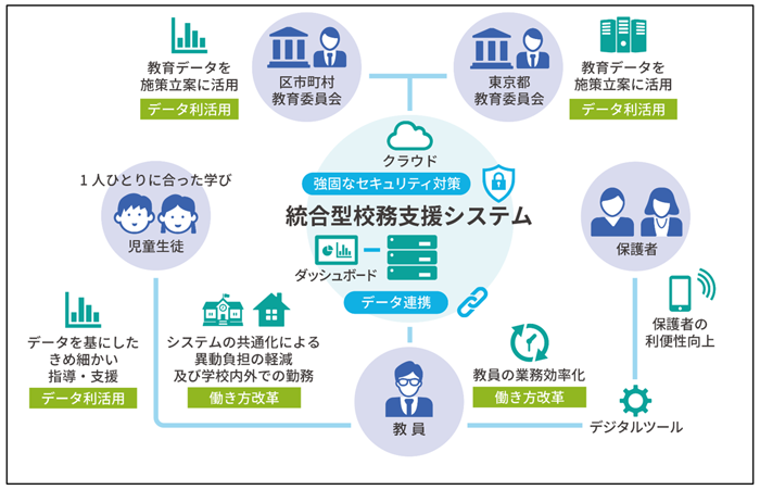 都教委は、都内公立小中学校等の統合型校務支援システムの共通化について、全区市町村と協議を重ね、「次世代校務DX環境の共通化方針」を策定済み。今後、システムの仕様検討・構築を行い、2028年度以降順次、都内で共通化された統合型校務支援システムを導入する予定だ。