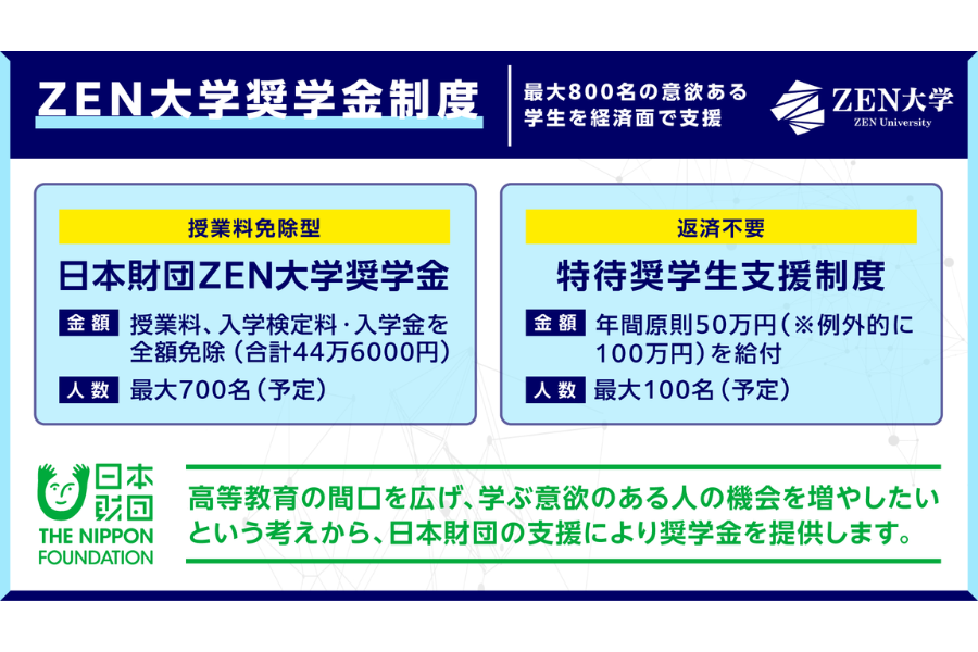 ZEN大学は10月1日より、意欲ある学生の学びを支援するための奨学金制度について、2026年度の募集を開始した。昨今の物価上昇などを受けて奨学金に対する高いニーズがあることから、2026年度は前年度より募集人数を増やし、最大800人の学びを経済面で支援する。