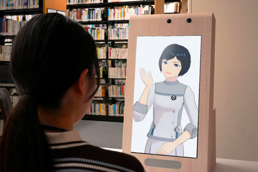図書館受付に設置したディスプレイに表示されるアバターを図書館員が遠隔操作し、利用者からの質問に応対する。対面では相談しづらいと感じる利用者でも、アバターとの対話なら心理的なハードルが低く、図書館の利用促進が期待されるという。また、多言語対応やテロップ表示による視覚的な支援も可能であるため、外国人学生や体の不自由な方へのアクセシビリティ向上にも寄与するほか、図書館員の在宅勤務の拡充など働き方改革も図る。