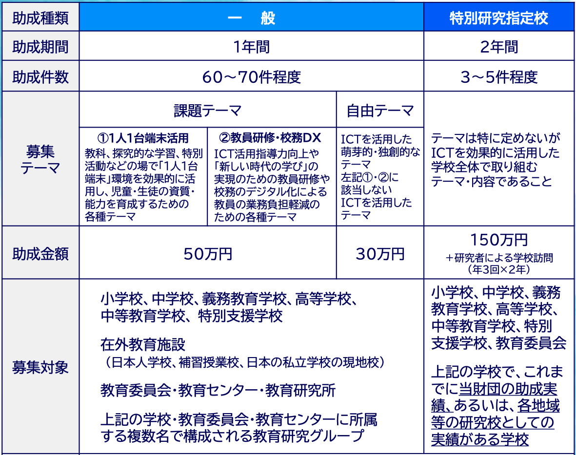 ICTを活用して学校現場の諸課題を改善・解決するための実践研究活動を募集する。今年度より、特別研究指定校と一般の重複申請が可能になった。詳細は同財団のWebサイトで確認できる。