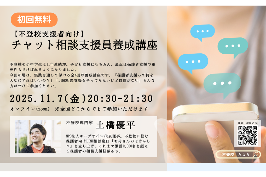 NPO法人キーデザインは、不登校支援者向け「チャット相談支援員養成講座」を11月7日より開始する。