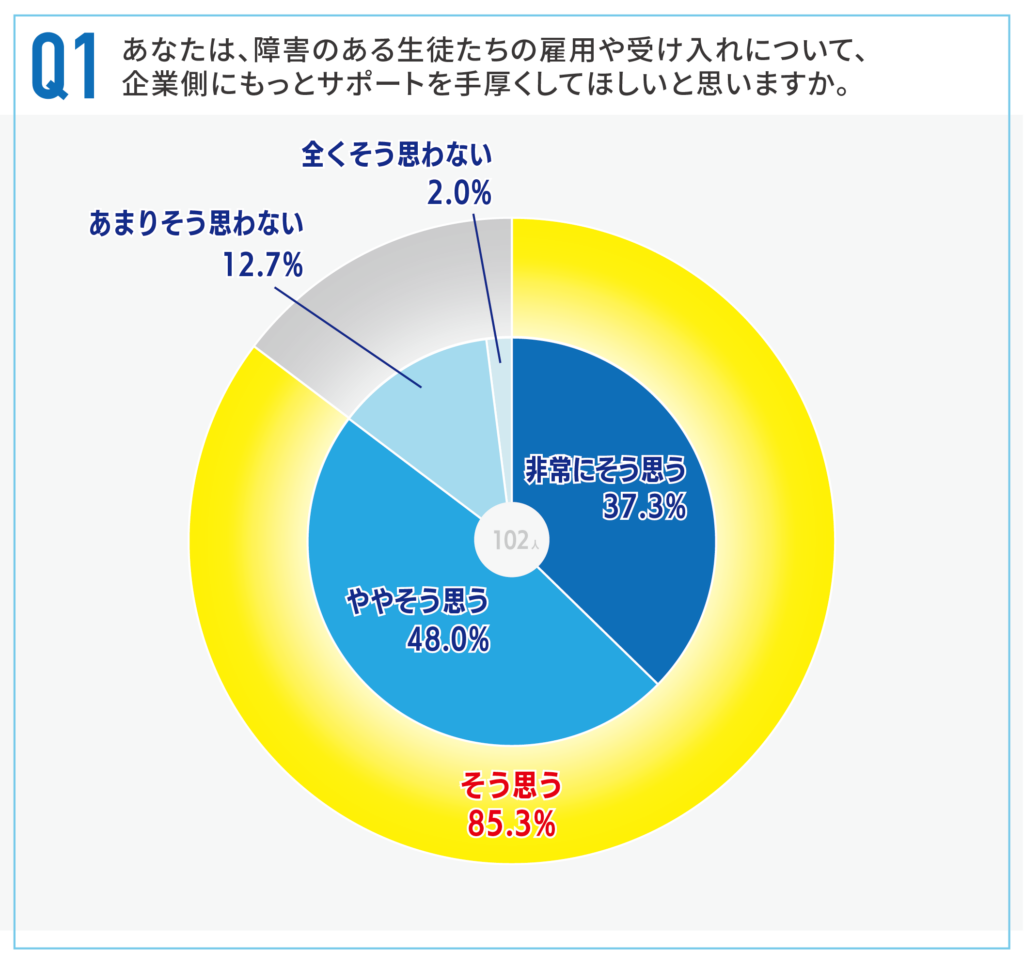 障害のある生徒の進路指導に現在携わる教員に「障害のある生徒たちの雇用や受け入れについて、企業側にもっとサポートを手厚くして欲しいと思うか」を問うたところ、約9割が、障害のある生徒たちの雇用や受け入れについて、企業側に「もっとサポートを手厚くしてほしい」と回答した。